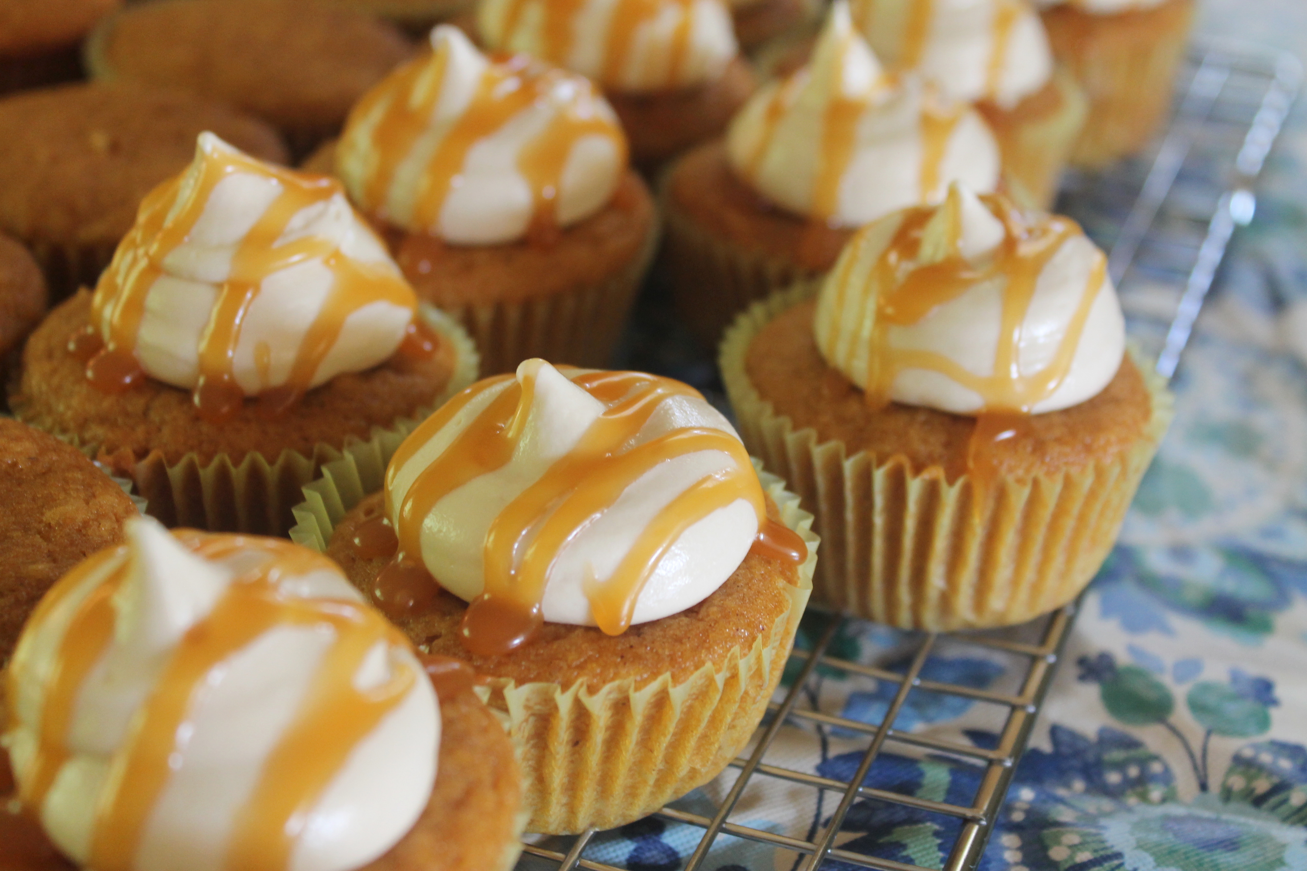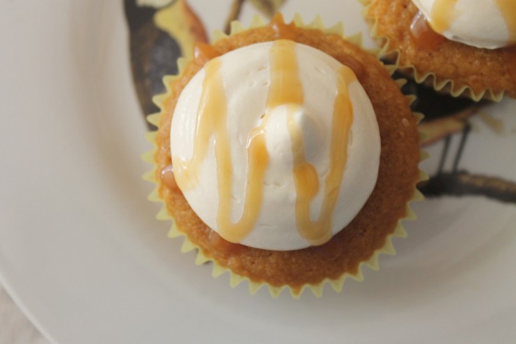 These cupcakes are so good! We brought them in to our Latin class for fun, and they were just right since it was the first day of October- the flavors are perfectly in season! Everyone who had one loved them, so we will happily make them again sometime soon. The homemade caramel sauce is what puts these over the top. If you have never had or tried to make homemade caramel sauce before, it’s not too hard and it is way better than store bought and is totally worth the extra effort! These cupcakes are not healthy at all, thanks to a lot of butter and sugar (we’ll be sharing a healthier recipe in the next day or two), but if you are going to eat the calories, you might as well spend them on these!