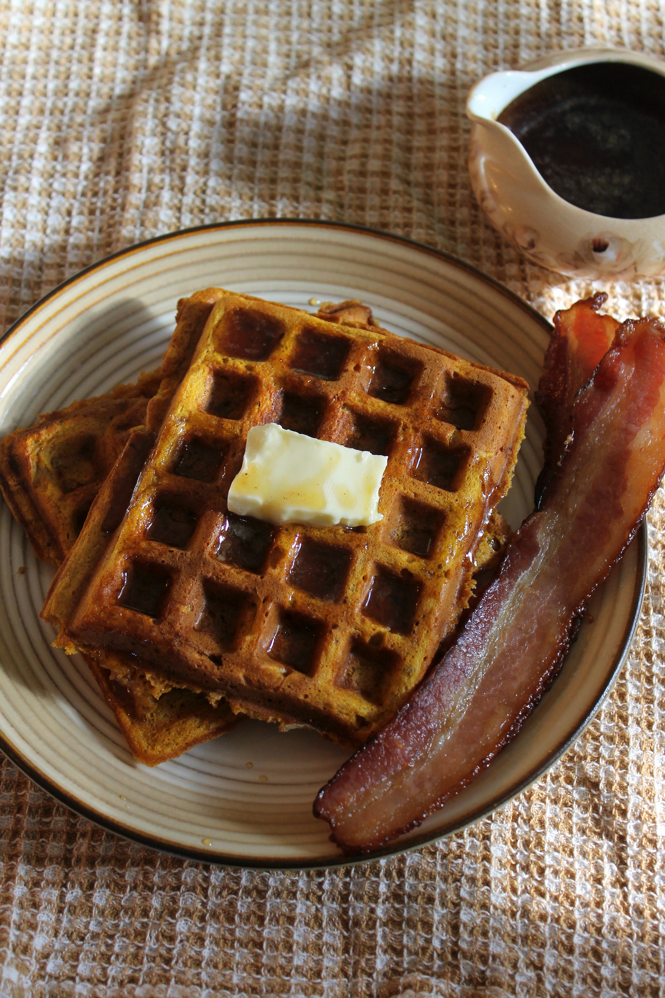 Our aunt recently sent us the King Arthur Flour Baker’s Companion cookbook. When looking through it, these waffles stood out and we finally got around to making them! And they were not a disappointment. These pumpkin waffles, paired with warm cinnamon maple syrup, butter, and a couple of slices of bacon, are a wonderful breakfast treat! They are made with half whole wheat flour, to make them a little healthier, and the chopped pecans add texture and protein. Of course, pairing them with whipped cream would probably make them out of this world! Don’t skip on this recipe- these waffles are good ones!