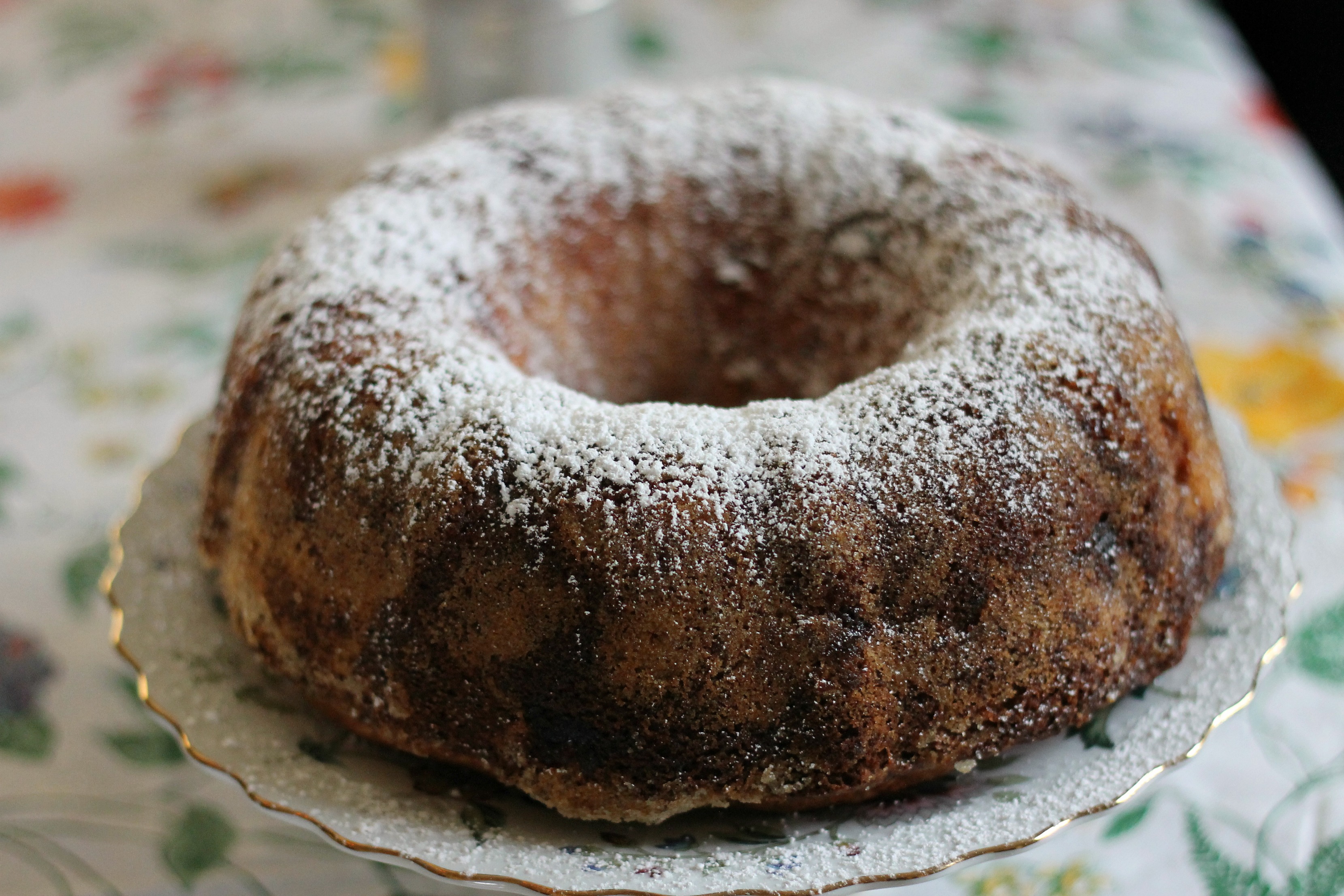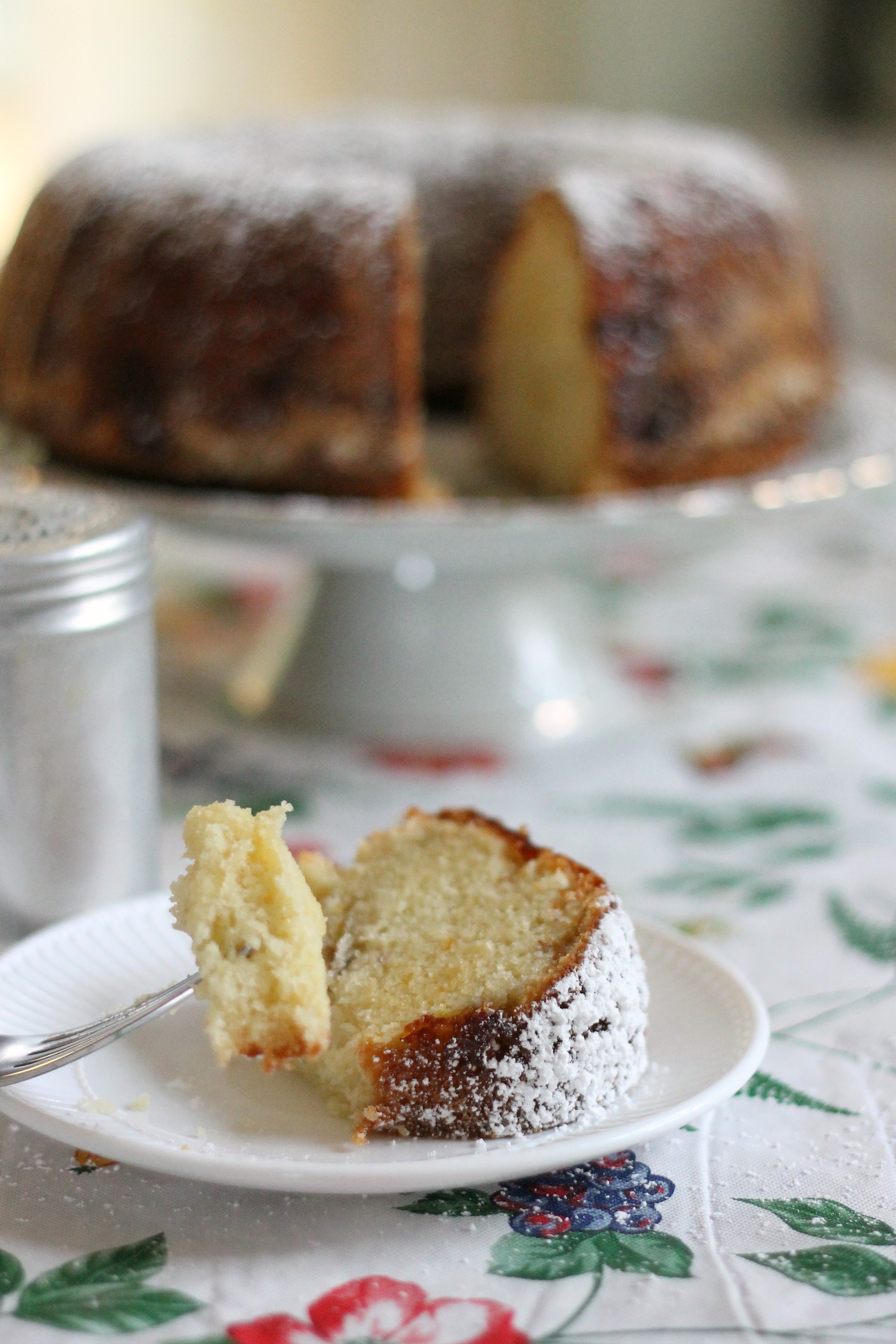 You might be wondering why we made a pound cake with peaches in it in October, instead of something normal and seasonal like apple pie. Well, we’ve had some chopped peaches that our grandmother froze for us about a month ago, when the peaches were getting overripe. Finally we had a chance to pull the peaches out of the freezer and use them in something! To prevent the peaches from releasing too many juices into the cake, we thawed and drained them first. The recipe then calls for dusting them in flour to prevent them from sinking. What you are left with is a perfectly moist pound cake with a peach chunks throughout. So, if you somehow managed to find some decent fresh peaches at this time of year, use them and this cake will be great. If you want to buy frozen peaches at the supermarket, this cake will be equally great! It’s truly one of the best pound cakes ever!