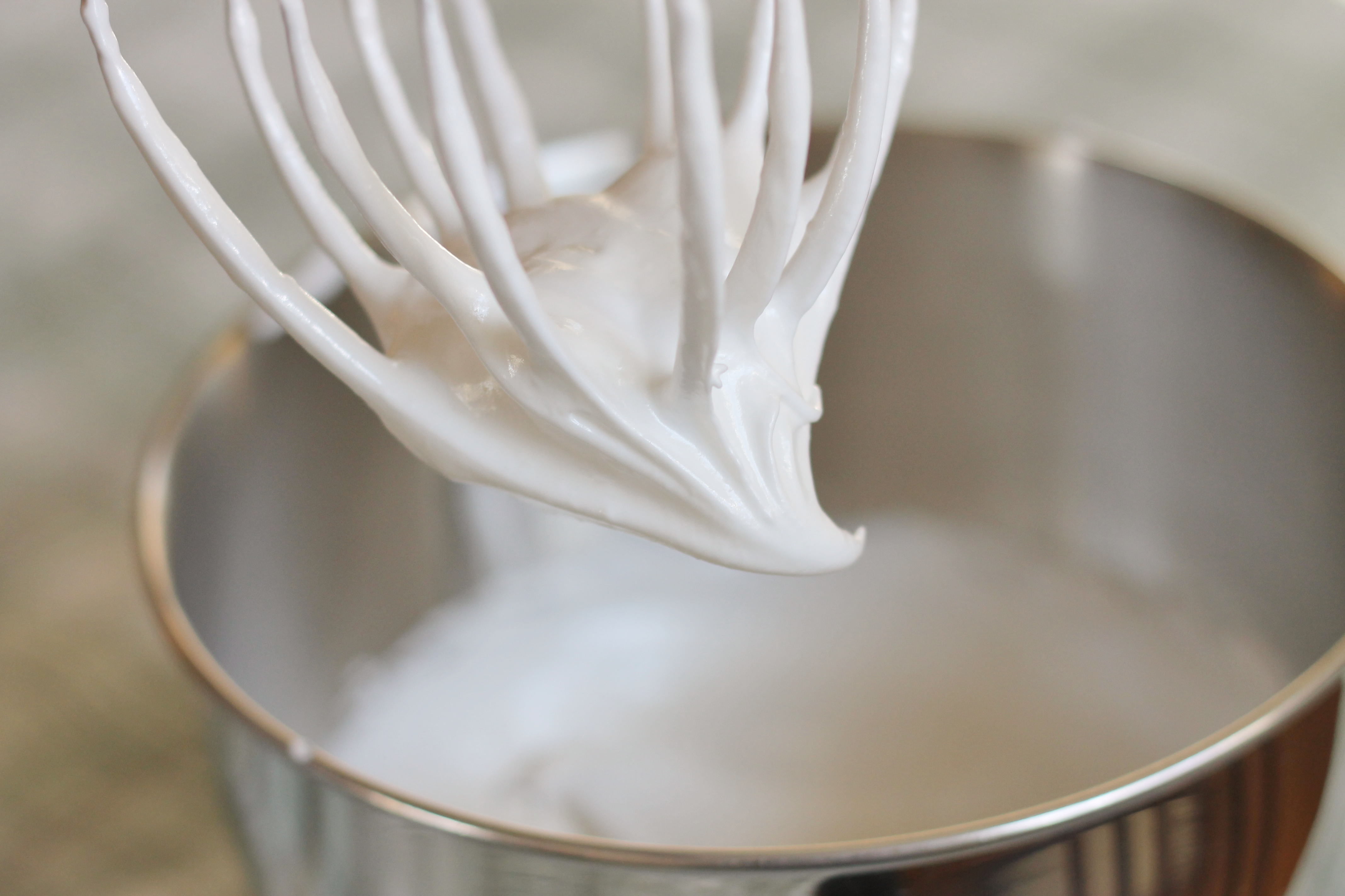 Combine the granulated sugar (minus the pinch) and water in a small saucepan over medium-high heat with a candy thermometer clipped to the side, which will make a syrup. When the temperature is around 200˚ F, combine the 90 grams of egg whites with a pinch of sugar. Begin whipping on medium-low speed. Continue whipping the whites on medium speed until they form soft peaks. If you get soft peaks before the syrup reaches the target temperature, reduce the speed to low to keep the whites moving.