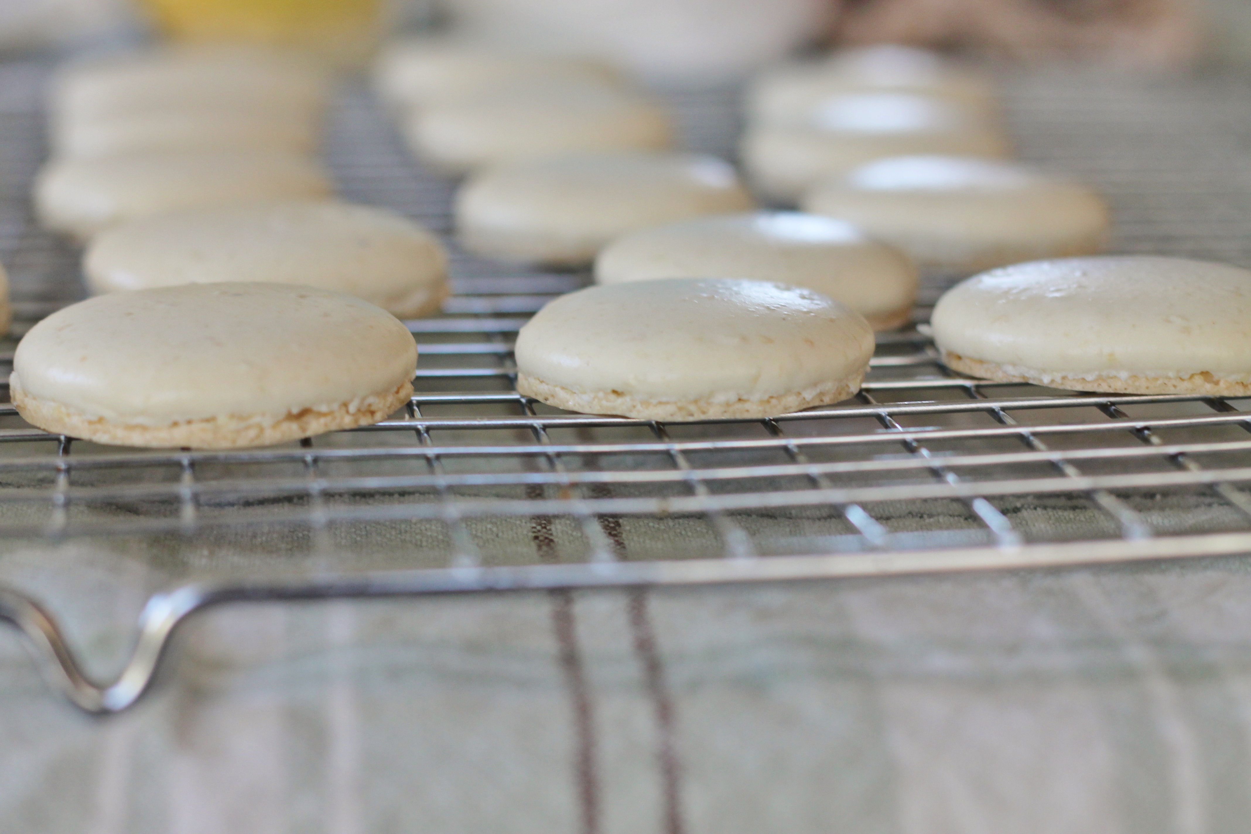 Transfer the baking sheet to the oven and immediately reduce the temperature to 325˚ F. Bake for 8-12 minutes, until the tops are smooth and set and “feet” have formed around the bottom. Watch them carefully so they don’t brown too much. Let the shells cool briefly on the baking sheet, about a couple of minutes, and then peel away from the parchment. They should come away easily. Transfer to a cooling rack. Repeat with the remaining batter, replacing the parchment paper with each batch. Before putting each new tray into the oven, bring it back up to 350˚ F. Once the shells are baked and cooled, match them up in pairs by size and sandwich with your filling. Store in an airtight container.