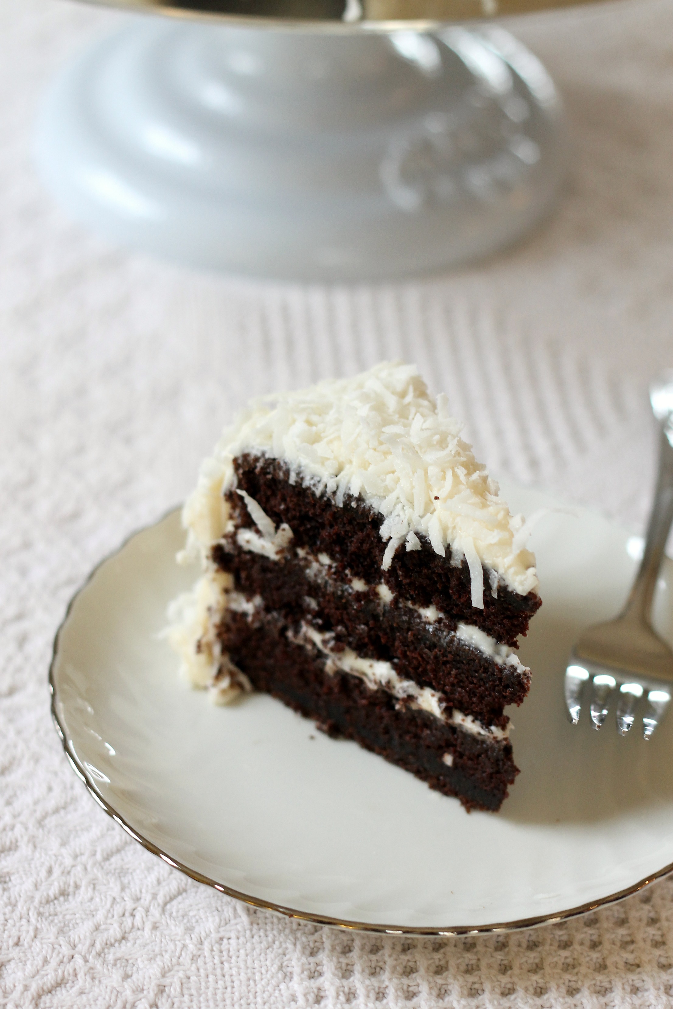 Place one cake round on a pedestal, turntable, or plate and cover with frosting. Repeat with the next layer. Put the final layer on top and cover the cake with frosting. Normally when frosting a chocolate cake with a light-colored icing a crumb coat is necessary, but since the cake will be covered with coconut, there is no need. Press coconut into the top and sides of the cake until it is completely covered. Enjoy!