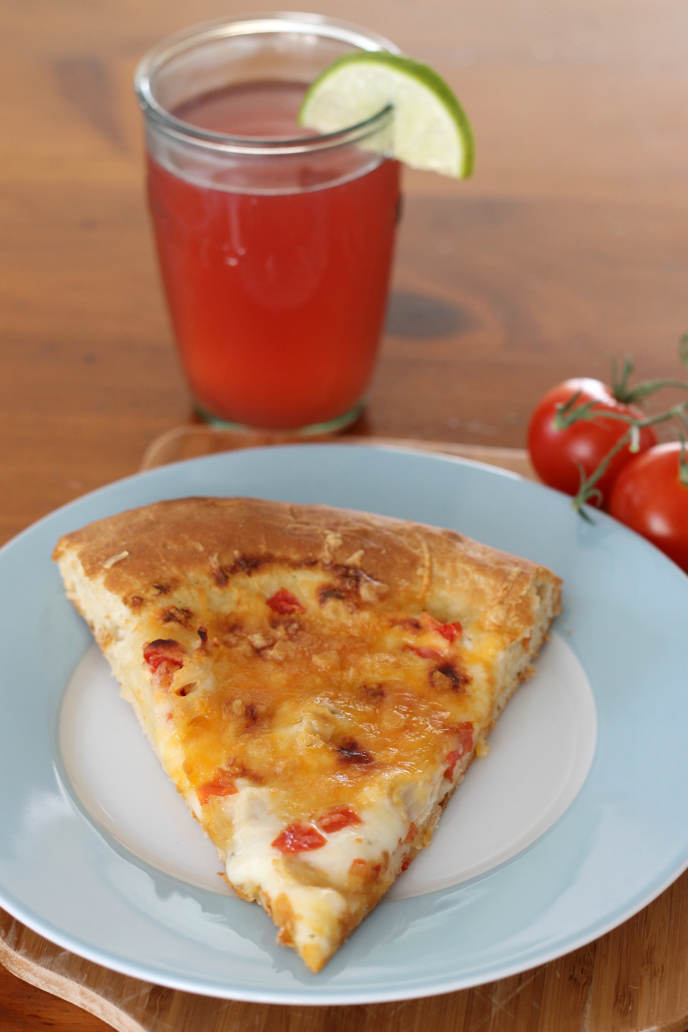 It starts with this perfect crust. Then, the crust is topped with ranch dressing, mozzarella, cheddar, grilled chicken, tomatoes, and green onions. We forgot to get the onions, so they aren’t on our pizza. We highly recommend adding them though! Another great addition would be bacon. If you like, feel free to make homemade ranch. Regardless, this is a super yummy pizza and was very much enjoyed!