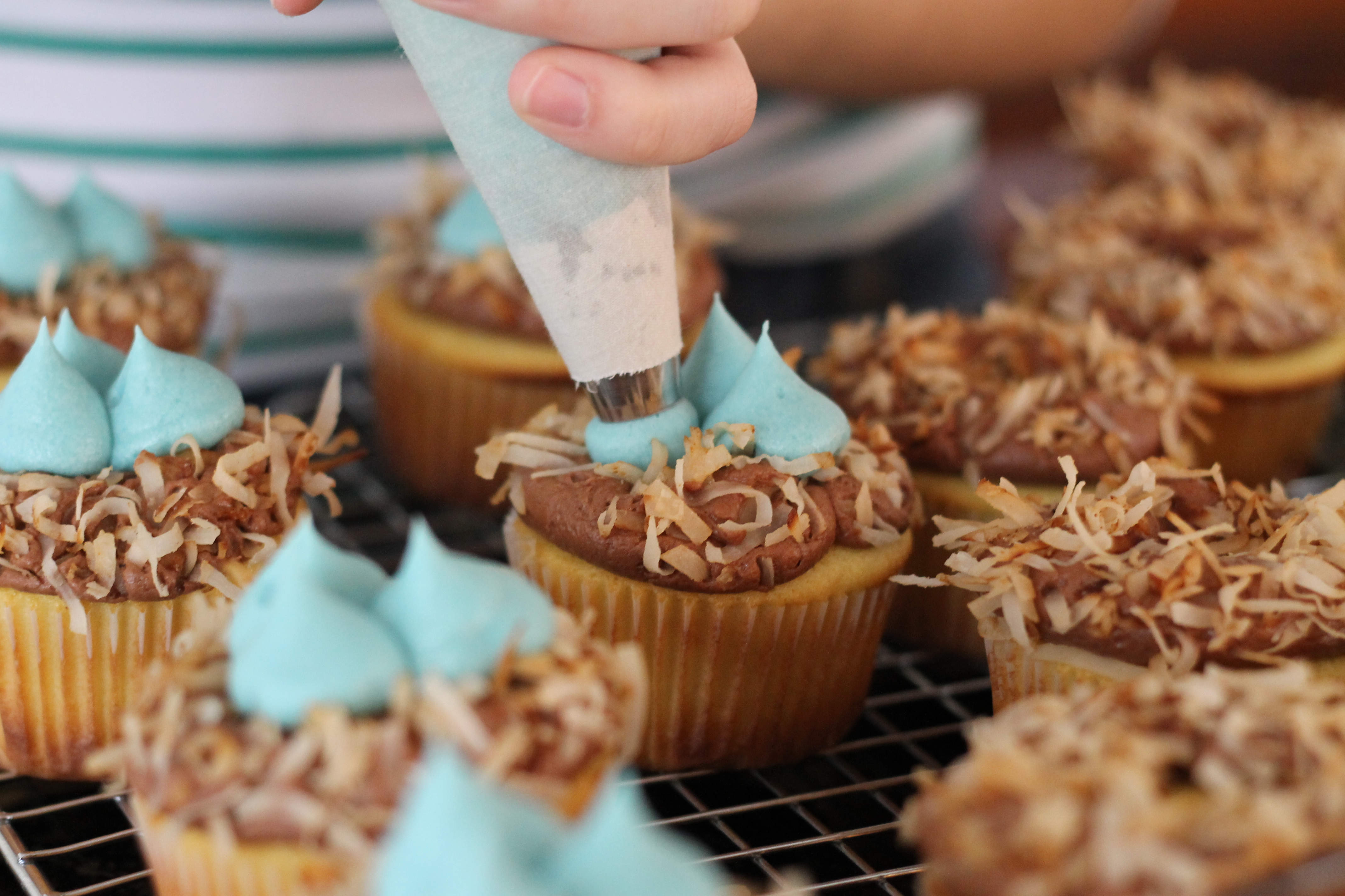 Coat the cupcakes in coconut, either sprinkling or dipping them. Gently press the coconut into the chocolate frosting. Shake off the excess.