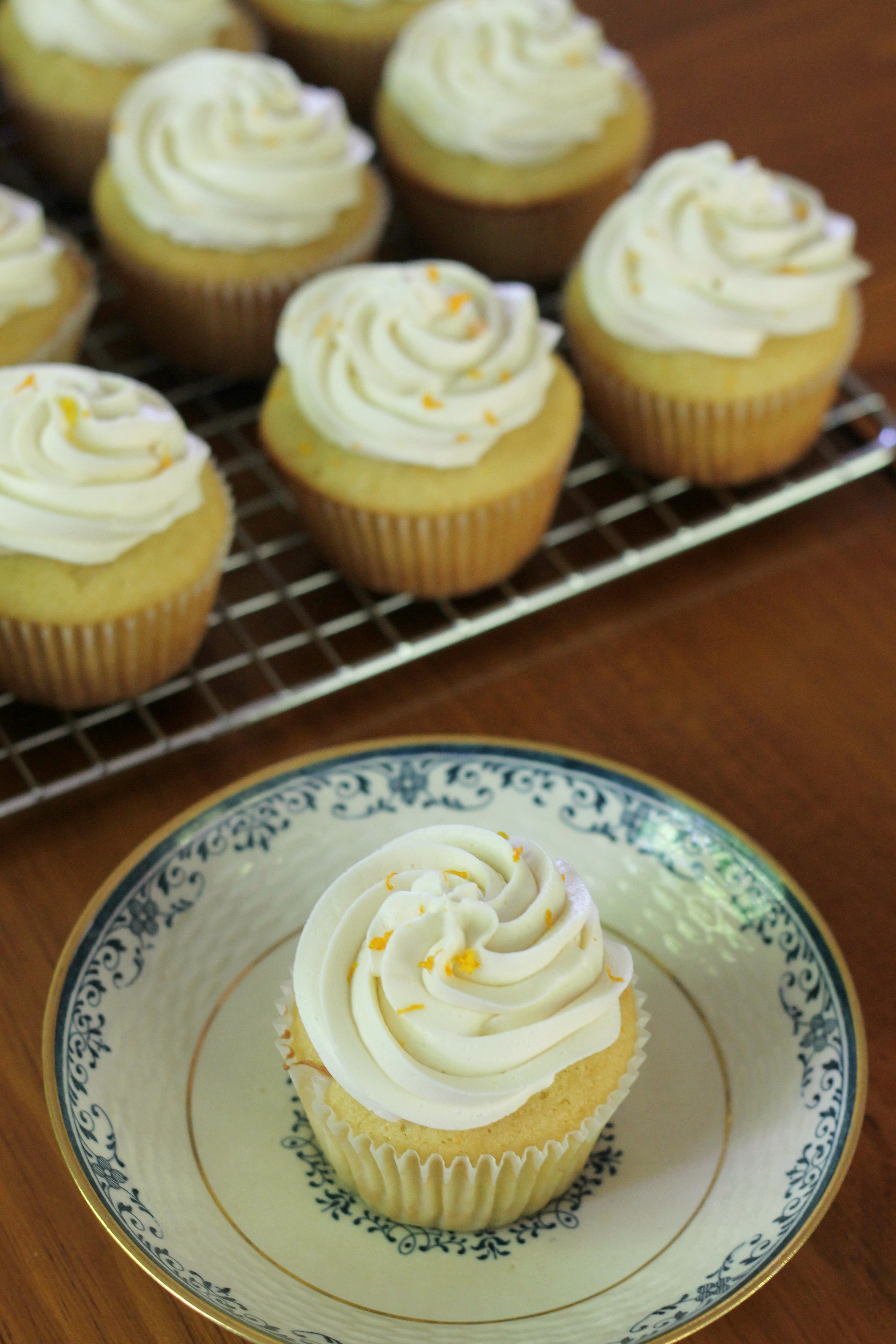 What does this have to do with cupcakes? Not much, except that elegant books go along quite nicely with an elegant dessert! So here is an elegant one: a tender orange cupcake topped with some fluffy vanilla bean buttercream. This is a lovely cupcake, ideal for any sort of gathering in the summer. We topped the cupcakes with a light sprinkling of orange zest, although sprinkles would be good here if you are planning to serve the cupcakes to kids who are pickier. The original recipe called for candied orange slices, but we didn’t have the small oranges needed so we didn’t make them. You will not be disappointed with these cupcakes no matter what garnish!