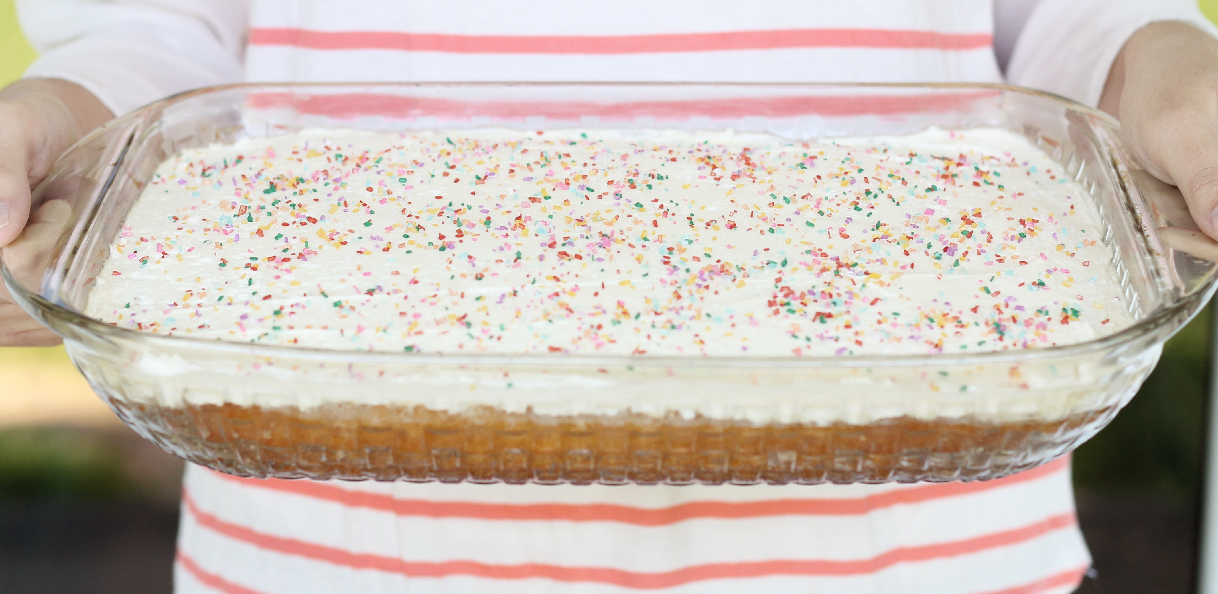 Add sugar, vanilla, milk, and pinch of salt and mix on low speed for 1 minute, then on medium speed for 6 minutes. Spread frosting over the top of the cooled cake and top with sprinkles, if desired. Cut into slices and serve. Enjoy!
