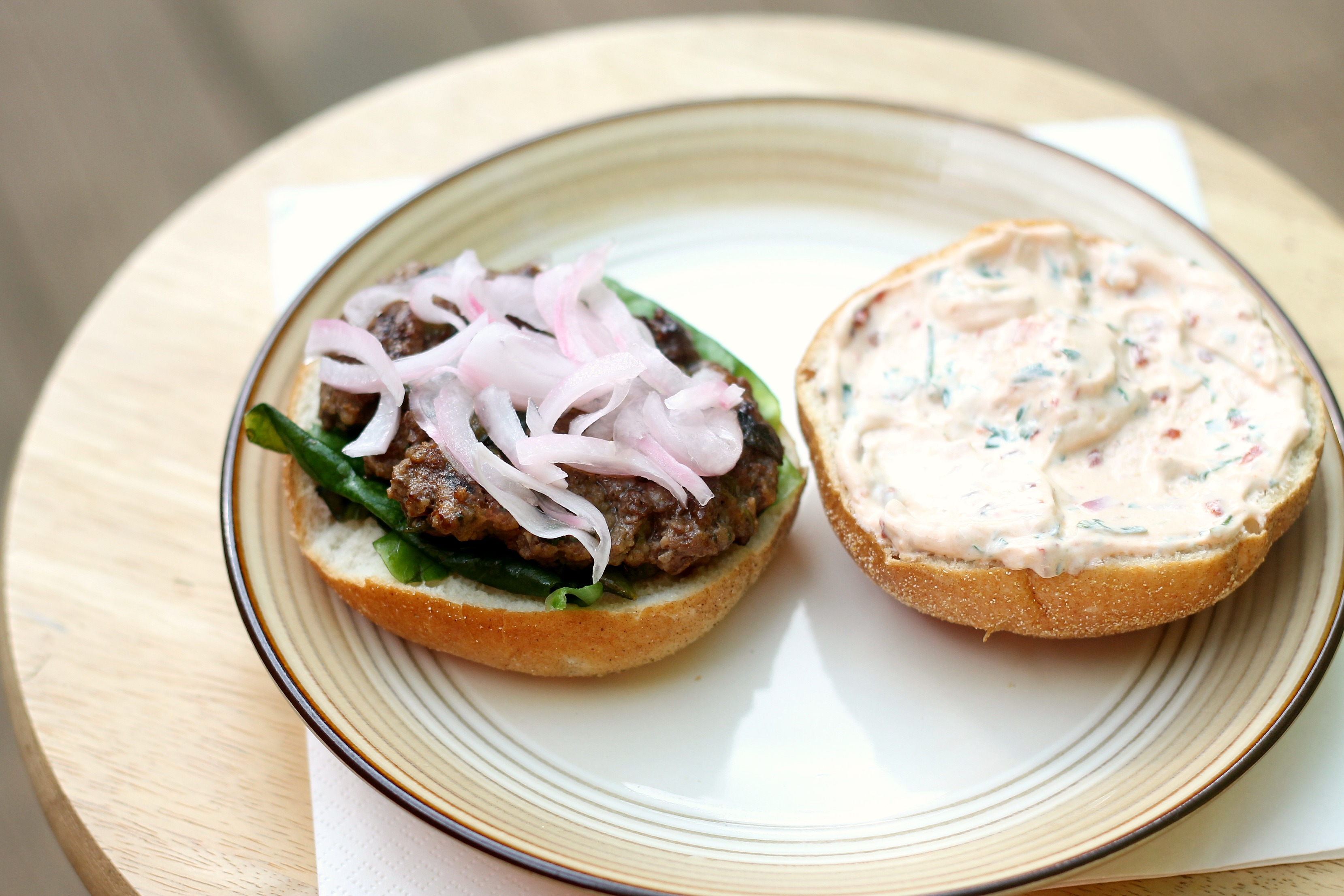 Spicy Poblano Burgers with Pickled Red Onions and Chipotle Cream Sauce (Long name!)