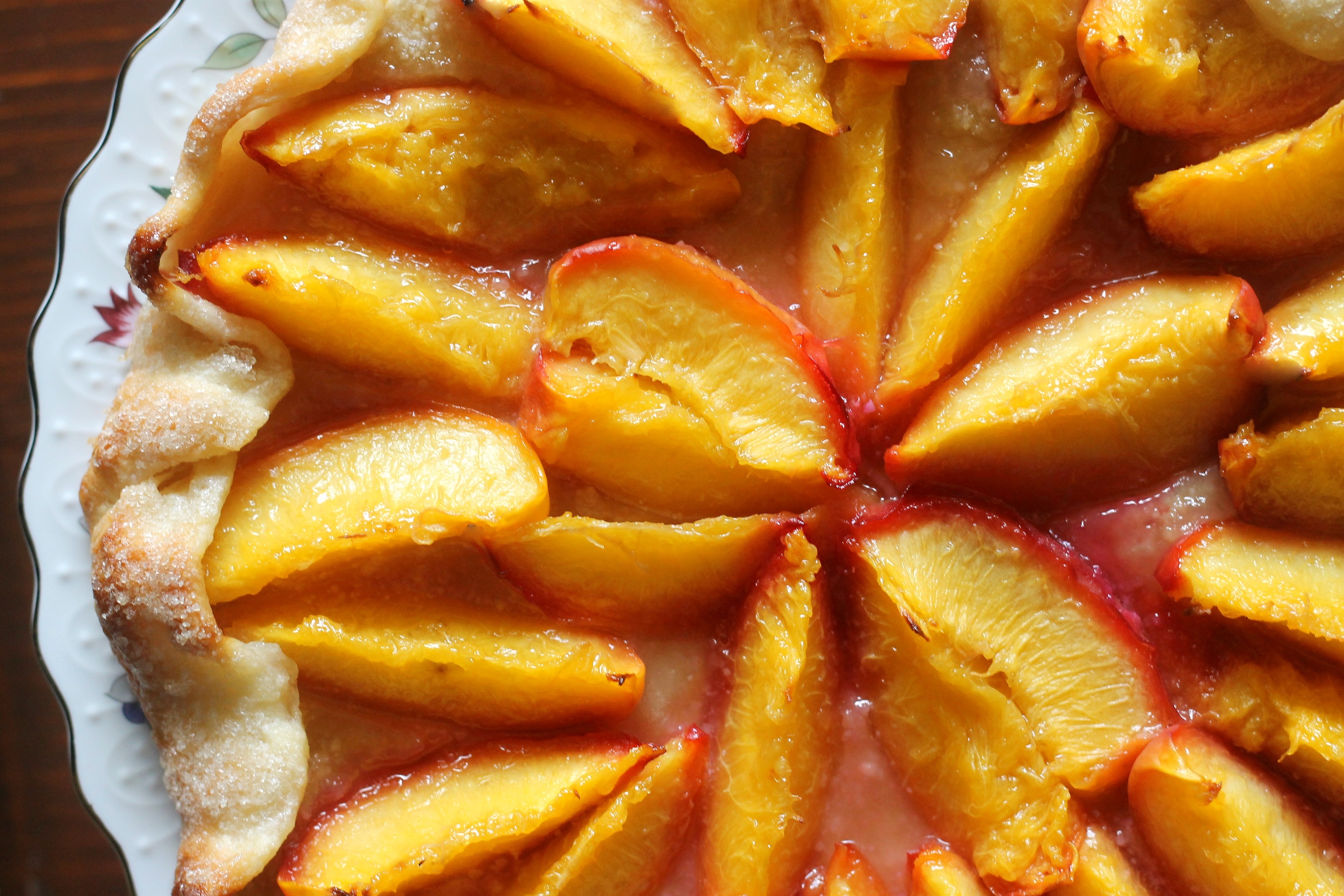 Wash your nectarines and slice (unpeeled) into 8 wedges. A hint for getting the two halves of the nectarine apart: slice on top of the small “seam” that runs down the side of the fruit. The pieces will come apart easily. Just remove the pit and slice! Combine your sliced nectarines and 1/4 cup of the sugar. Remove the dough from the freezer and top with the almond mixture, leaving about a 2-inch border. Arrange your nectarine slices in tight concentric circles, making sure to leave the 2-inch border bare. Fold the border up over the edge of the fruit, crimping as you need to and making sure there are no holes in the dough.