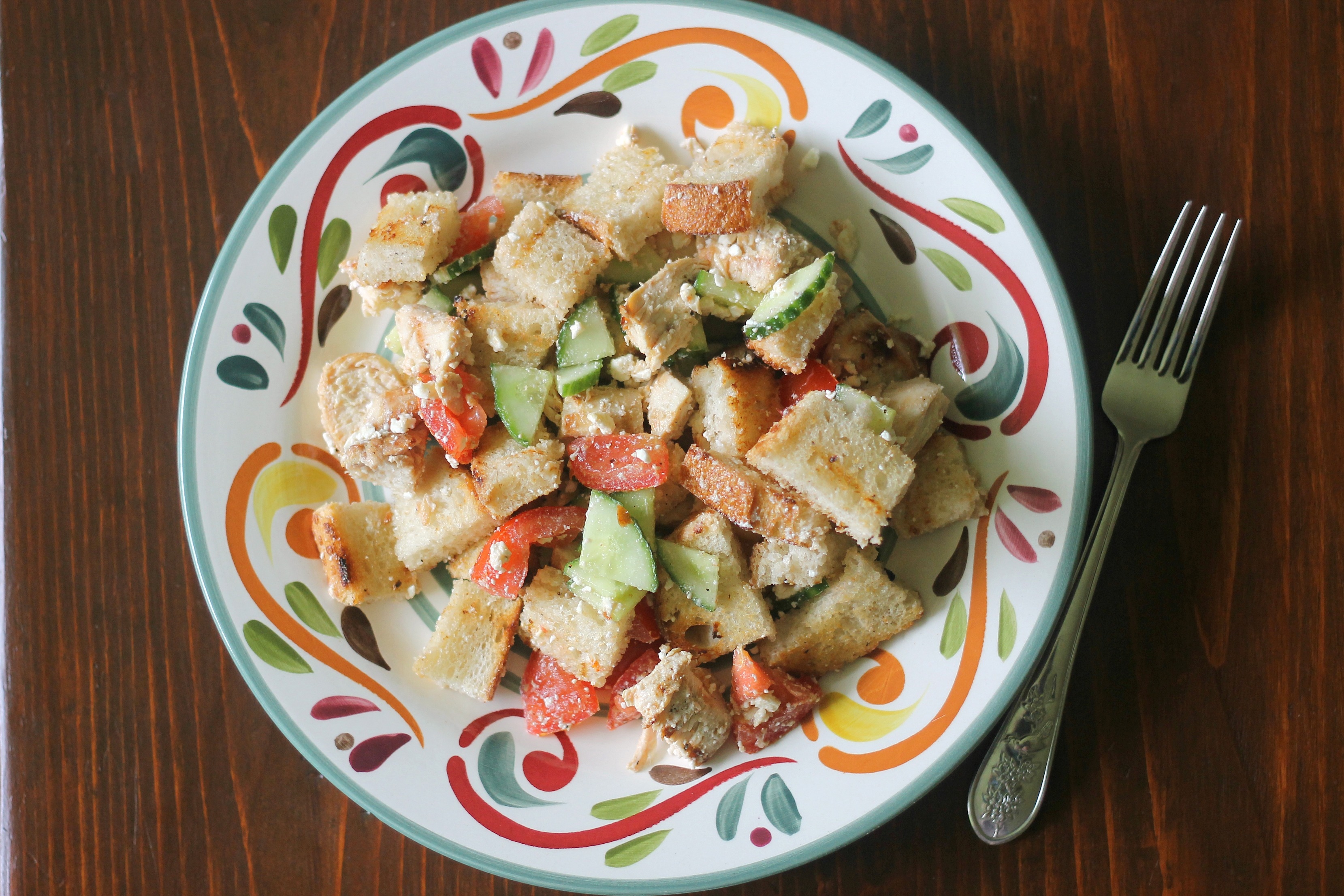 Place the slices of bread on the grill and cook until each side is toasted (but not charred), 2-3 minutes. Cut the chicken and bread into 1-inch pieces and toss with the cucumbers, tomatoes, and feta in a large bowl. This is best served immediately. Enjoy!