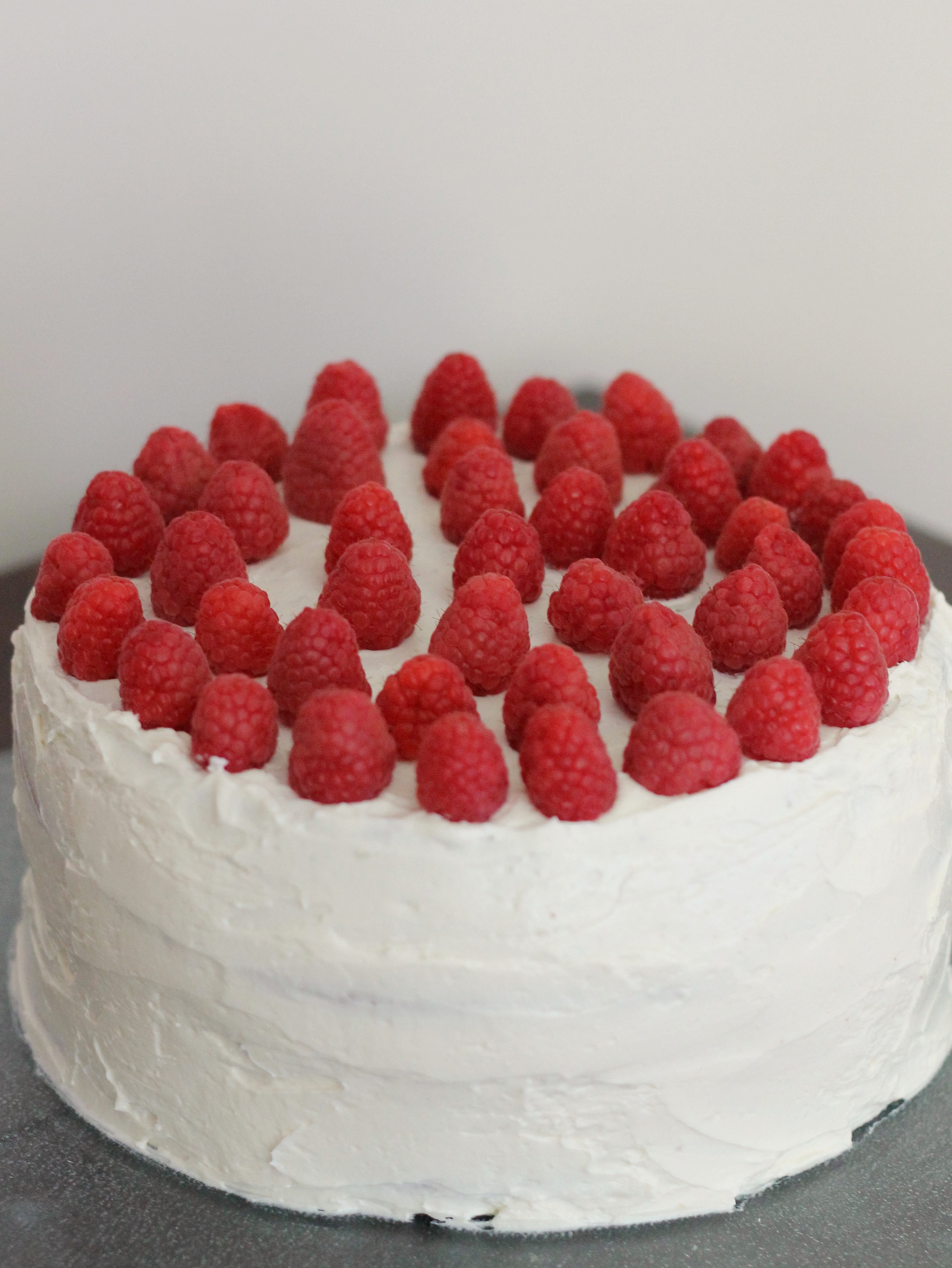 Note: Keep this cake in the fridge if you are not serving it for several hours. It will be good for 2 days. We really like it cold out of the fridge, but it’s also delicious at room temperature. Also, take not that while this recipe calls for 4 6-ounce containers of fresh raspberries, you’ll probably only need about 3. We accounted for bruised or broken raspberries that we did not want to put on the cake.