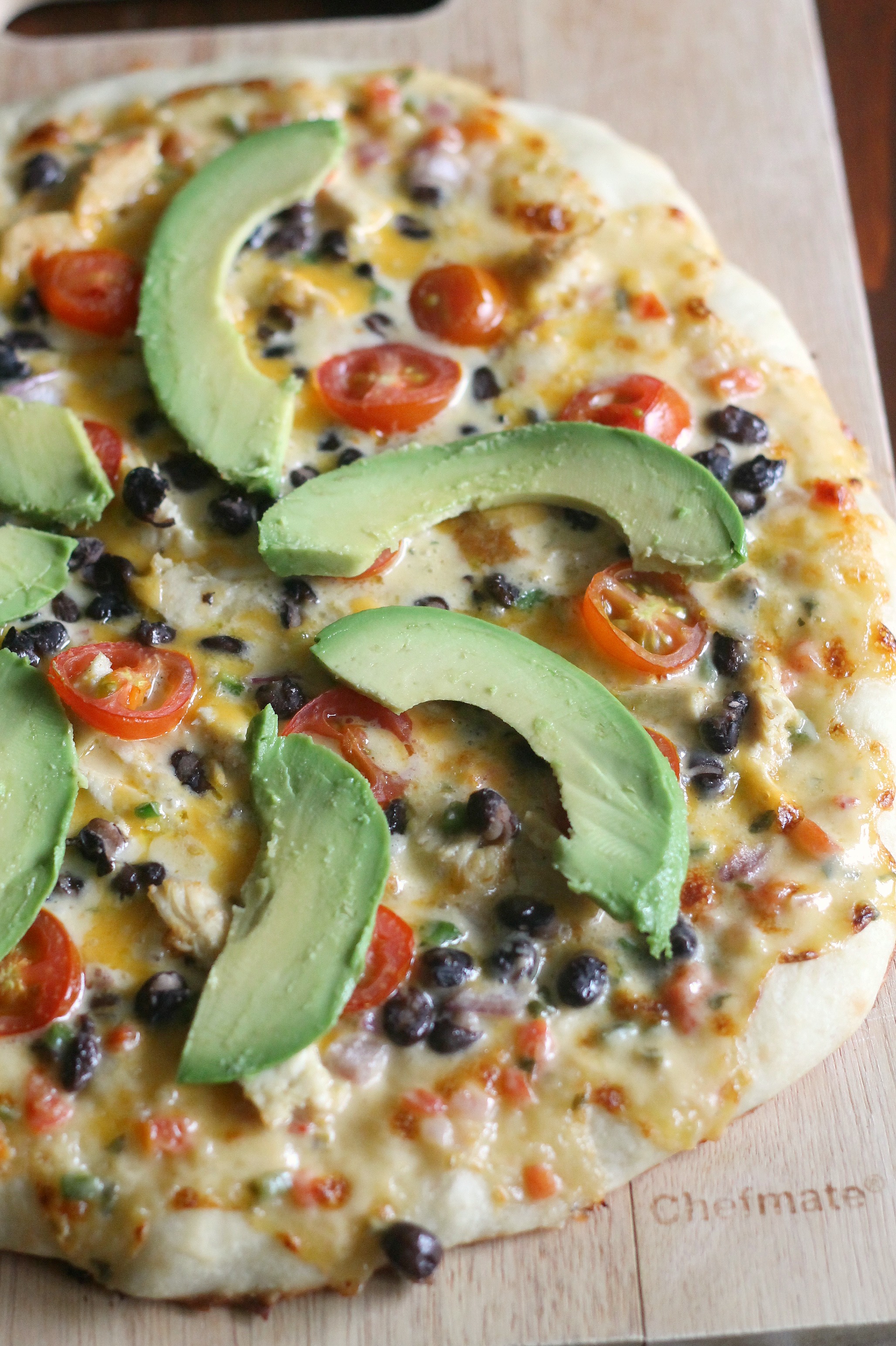 Pizza with Queso Sauce, Avocado, Cumin-Lime Chicken, and Black Beans