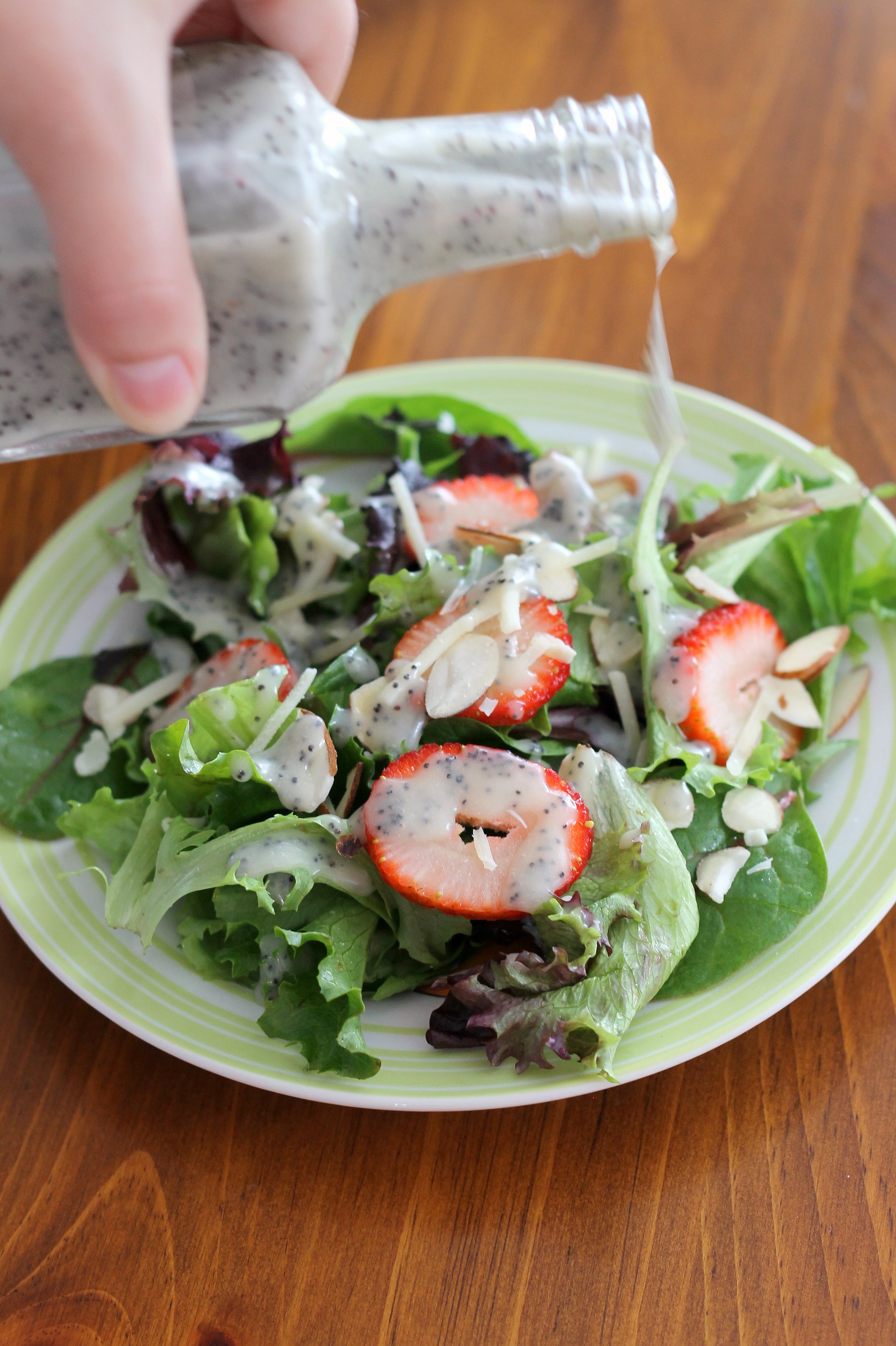 Lighter Poppy Seed Dressing on a Strawberry, Parmesan, and Almond Salad