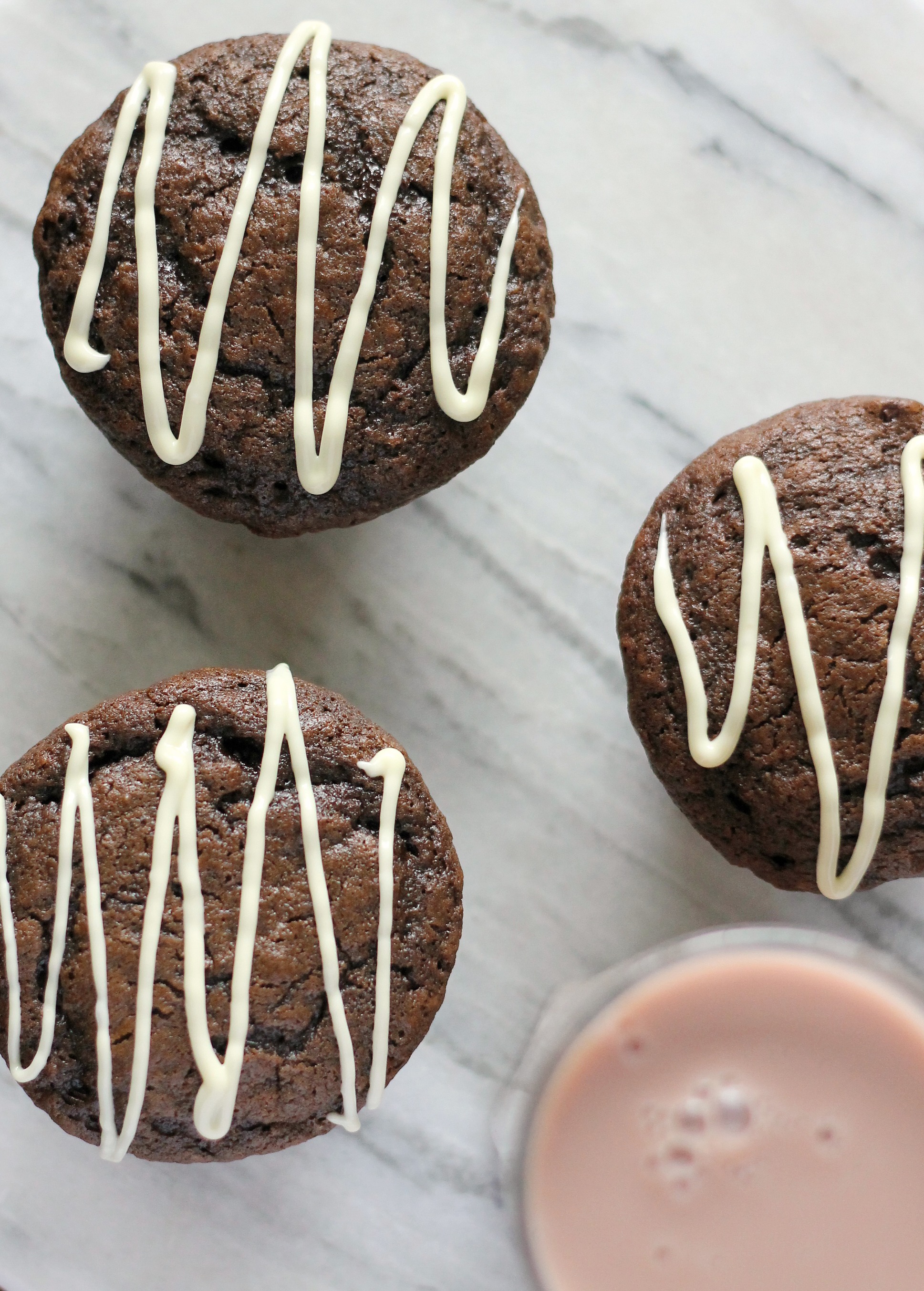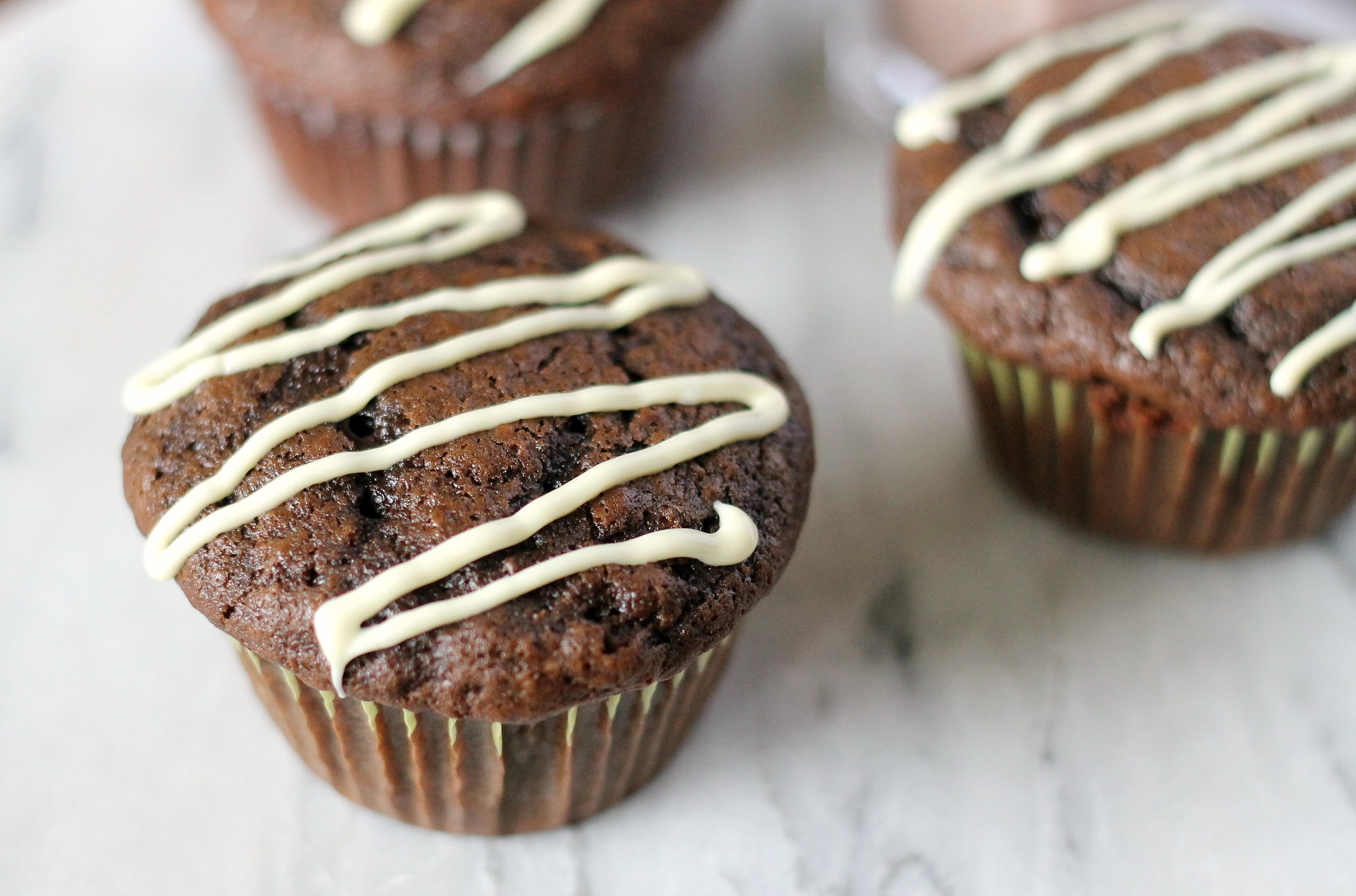 These muffins may be close to the cupcake end of the spectrum, but they are worth every calorie. They are rich chocolatey muffins studded with chocolate chips and topped with a white chocolate drizzle (which leaves them with a Hostess-esque look). The chocolate flavor is amped up with a bit of espresso powder, one of our favorite pairings with chocolate. The cupcakes don’t taste like coffee, don’t worry- the espresso powder just helps heighten the chocolate flavor. They’re some of the yummiest muffins we’ve made in a while, and we know that you’ll love them too!