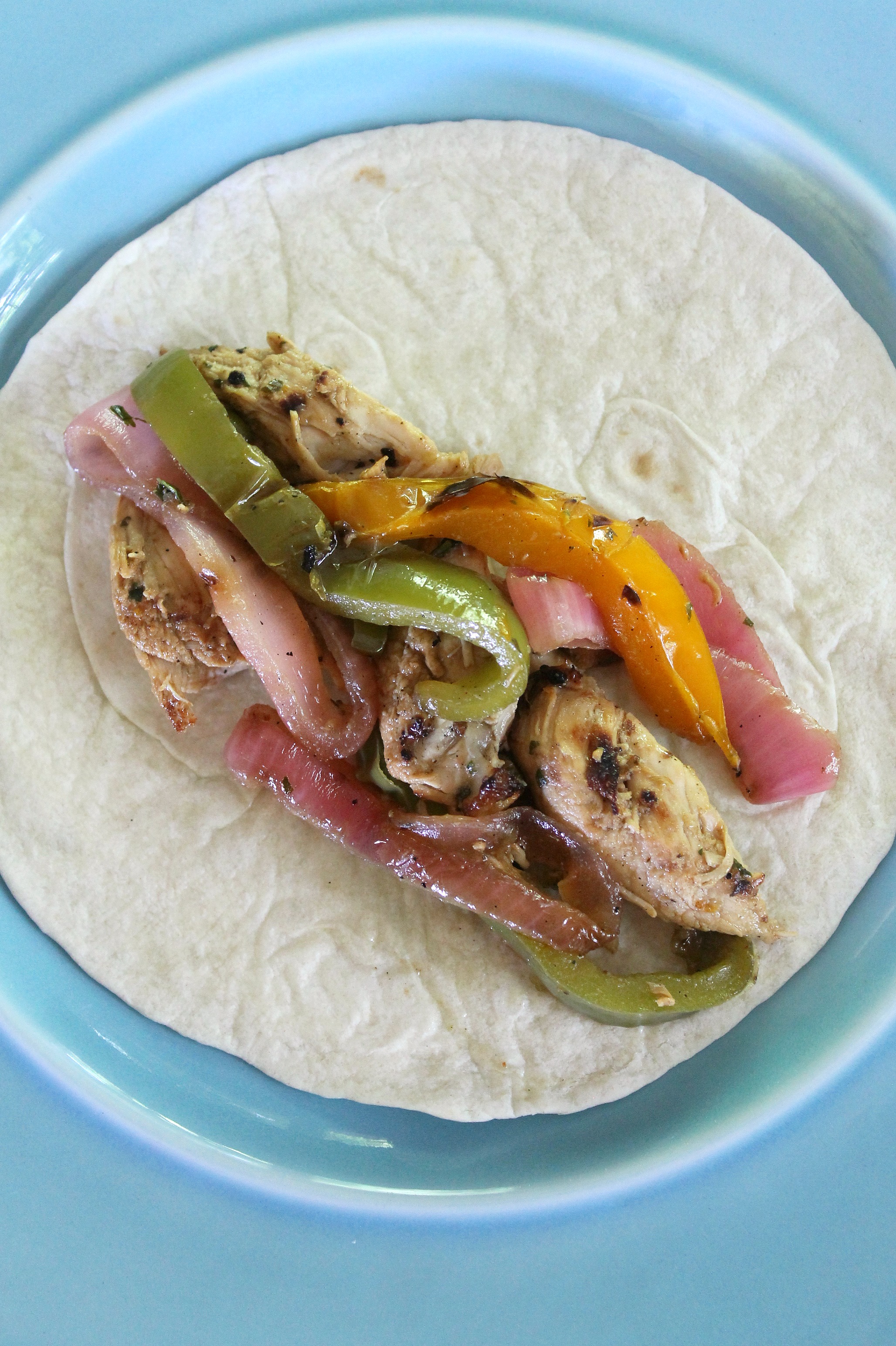 Remove the chicken and vegetables from the grill and transfer to a cutting board. Separate the onion rings and place into a large bowl. Slice the bell peppers into 1/4-inch-thick strips and add to the bowl with the onions. Stir in 2 tablespoons of the reserved (unused) marinade. Slice the chicken into 1/4-inch slices and toss with the other 2 tablespoons of reserved marinade in another bowl. Serve the chicken and vegetables inside the warmed tortillas and enjoy!