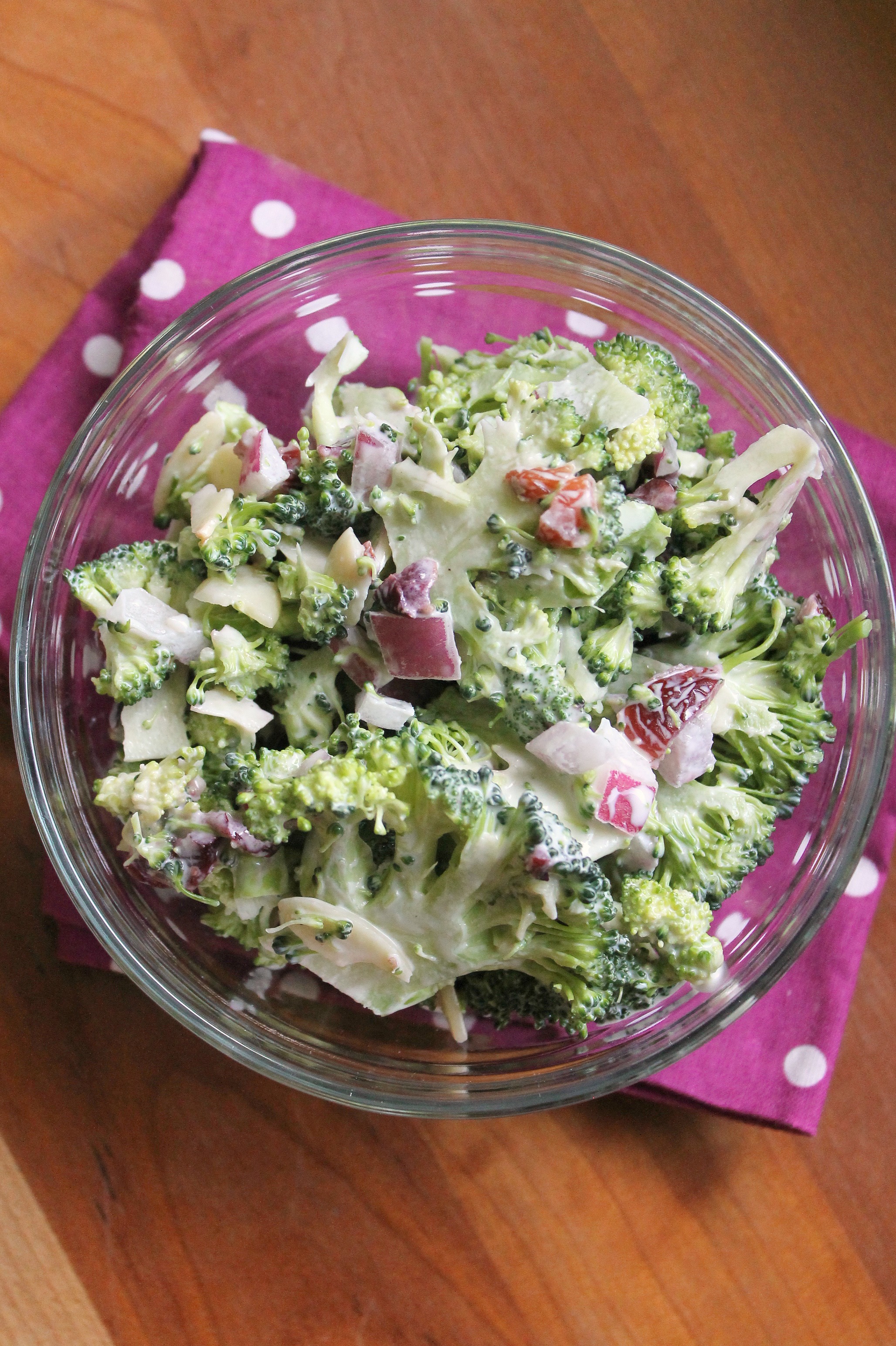 The food at orientation, while tasty and better than a lot of cafeteria food, wasn’t exactly healthy, nor was the food we ate on vacation. Vegetable-heavy foods like this broccoli slaw sound pretty good right now! We decided to make this slaw on a whim as a side for burgers and it way outshone them. Who would’ve thought that a bowl of 2 heads of broccoli could taste fabulous? I am a believer now, but trust me- in the past, broccoli has been far from my favorite vegetable. This slaw could change that.