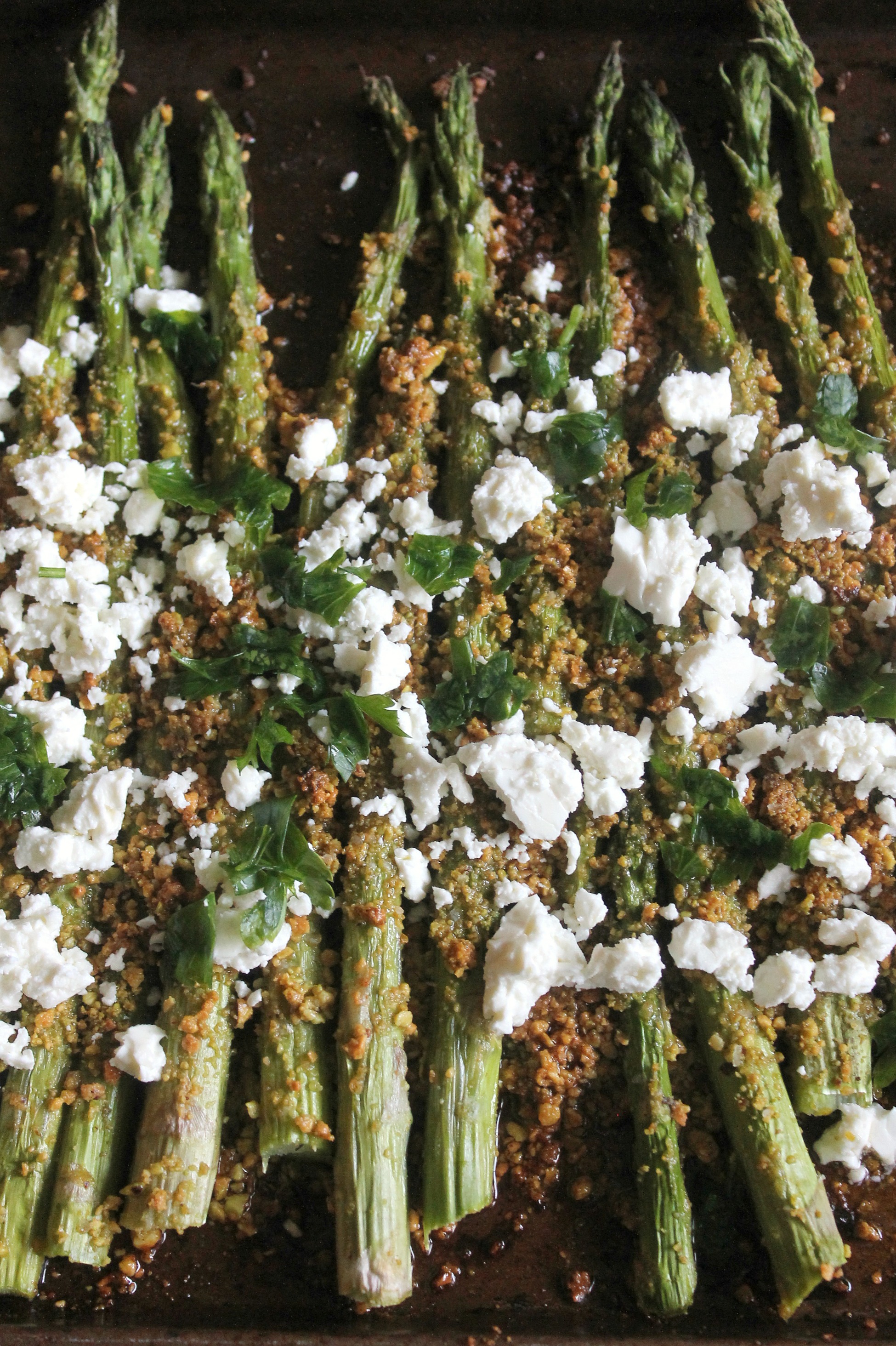 Asparagus is one of our favorite vegetables, but it is so easy to make bland. If all you’ve ever had is steamed/boiled asparagus with salt and pepper, then this will be a great change. This asparagus is roasted with olive oil and pistachios, then topped with a vinaigrette, crumbled feta cheese, and parsley. It’s fantastically flavorful and the perfect summer side dish since it’s quick to prepare.