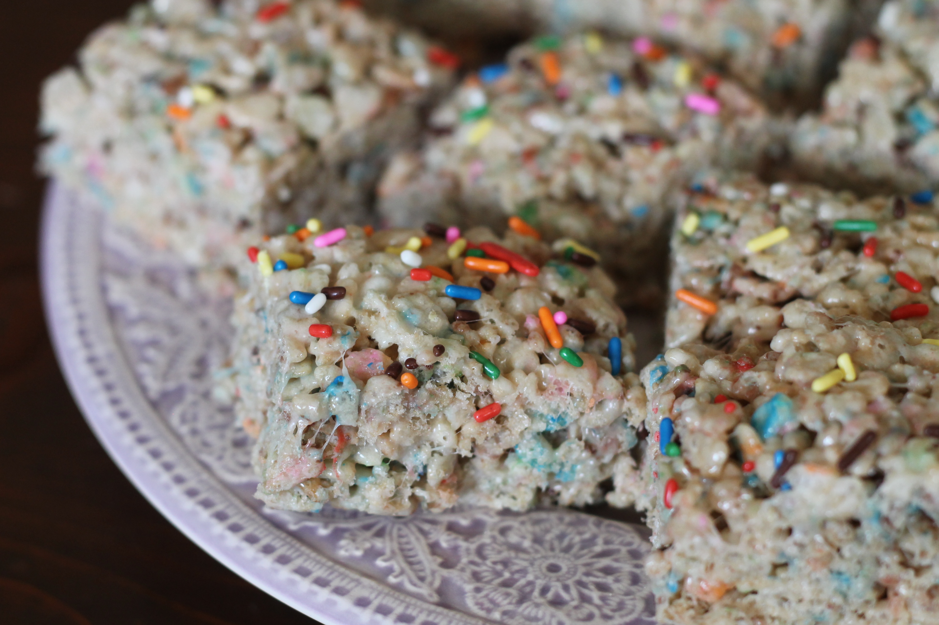 Stir in the cereal until it is evenly coated with the marshmallow mixture. Stir in half of the sprinkles. Press the mixture into the prepared baking pan and top with the remaining sprinkles. Let the rice krispie treats set, and then slice and enjoy!