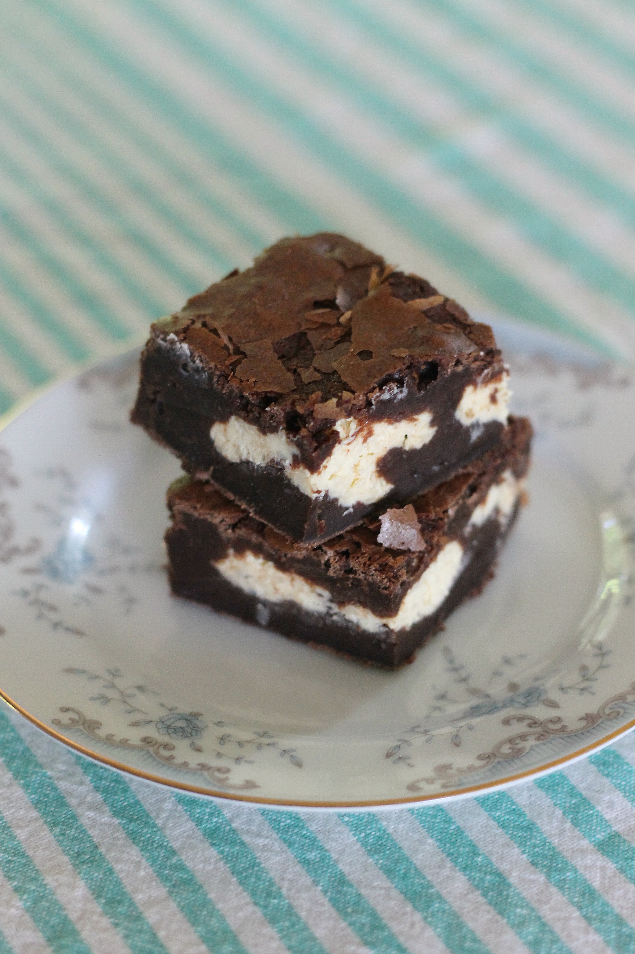 While summer is probably best suited for lighter desserts incorporating all the gorgeous fresh fruit that is available, brownies know no season! These particular brownies are extraordinarily fudgy with a thick ribbon of coconut flavored cheesecake. We made these when our brothers had friends over to watch the NBA Finals, and it took some real effort to put aside a couple for photographs! But these are meant to be shared- they’re just too good not to. The brownies pictured here are chilled, which is my personal favorite way to enjoy them (plus, they slice very neatly). Next time we may try replacing the butter in the brownies with coconut oil for enhanced coconut flavor. I think toasted coconut would also work very nicely in the filling!